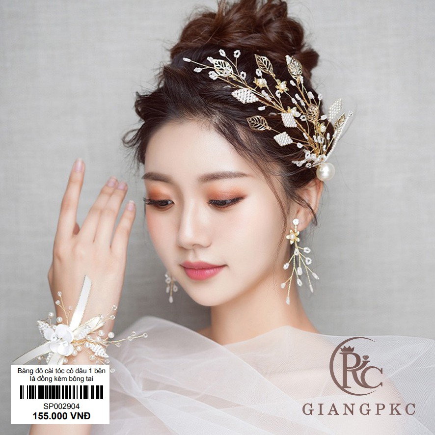 Phụ Kiện Thời Trang > Phụ kiện tóc > Băng đô tóc || Băng đô cài tóc cô dâu một bên lá đồng kèm bông tai Giangpkc Sp002904