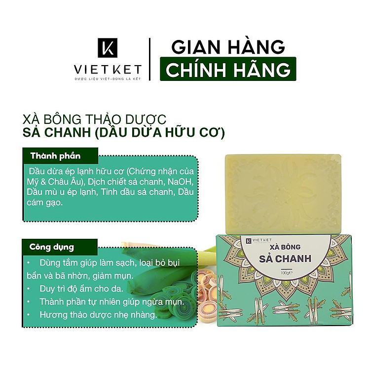 Xà bông Sả Chanh (Dầu Dừa Hữu Cơ) VIETKET là sự kết hợp tinh túy của các loại tinh dầu, thảo dược có thành phần tự nhiên dưới bàn tay của VIETKET