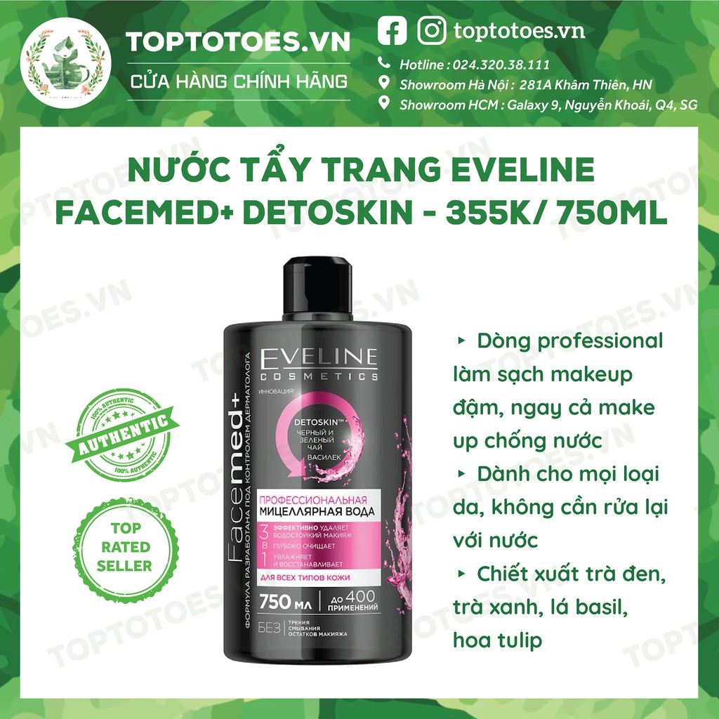 Giới thiệu Nước tẩy trang Eveline Facemed+ Detoskin 750ml lành tính, tẩy sạch hiệu quả lớp make up chống nước