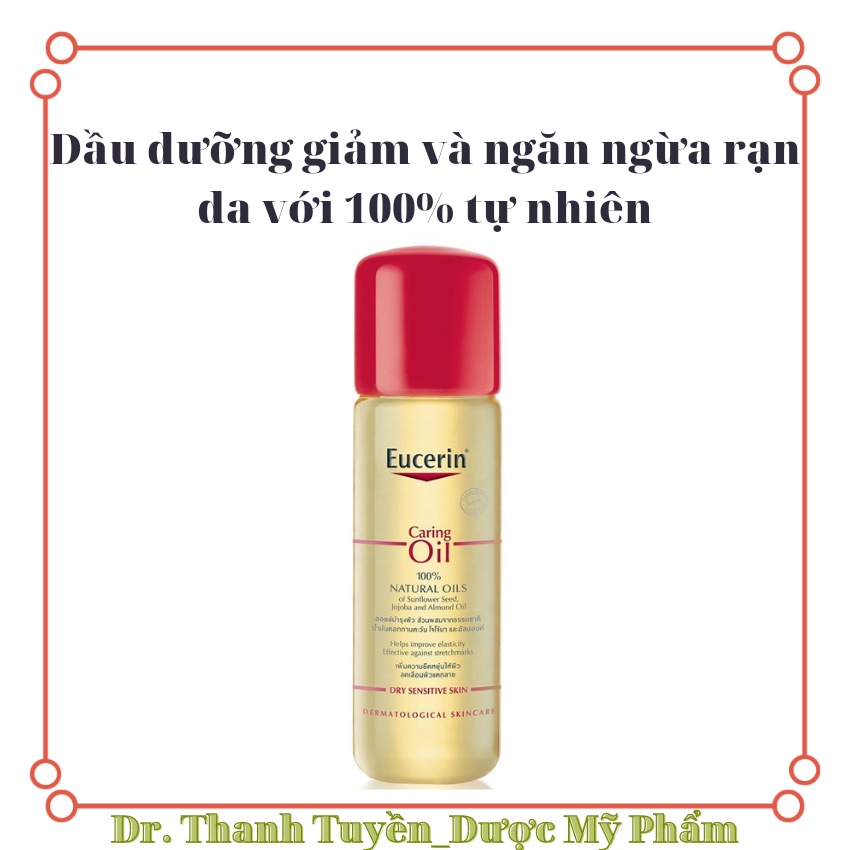 - Dầu dưỡng dành cho da khô và da nhạy cảm: Eucerin Natural Caring Oil được phát triển dành riêng cho nhu cầu chăm sóc của da khô và da nhạy cảm, ngay cả trong thời gian mang thai. Sản phẩm chứa Vitamin E và các loại dầu thực vật nguyên chất, giàu axit Linoleic, giúp tăng cường chức năng hàng rào tự nhiên của da. Dầu nhanh chóng được hấp thụ vào da khi
