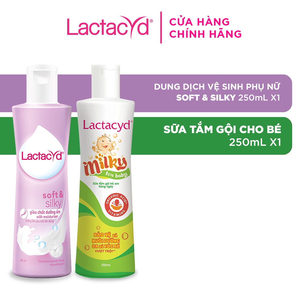 Giới thiệu Bộ Dung Dịch Vệ Sinh Phụ Nữ Lactacyd Soft & Silky Dưỡng Ẩm 250ml + Lactacyd Milky Bảo Vệ, Nuôi Dưỡng Da và Tóc Bé 250ml