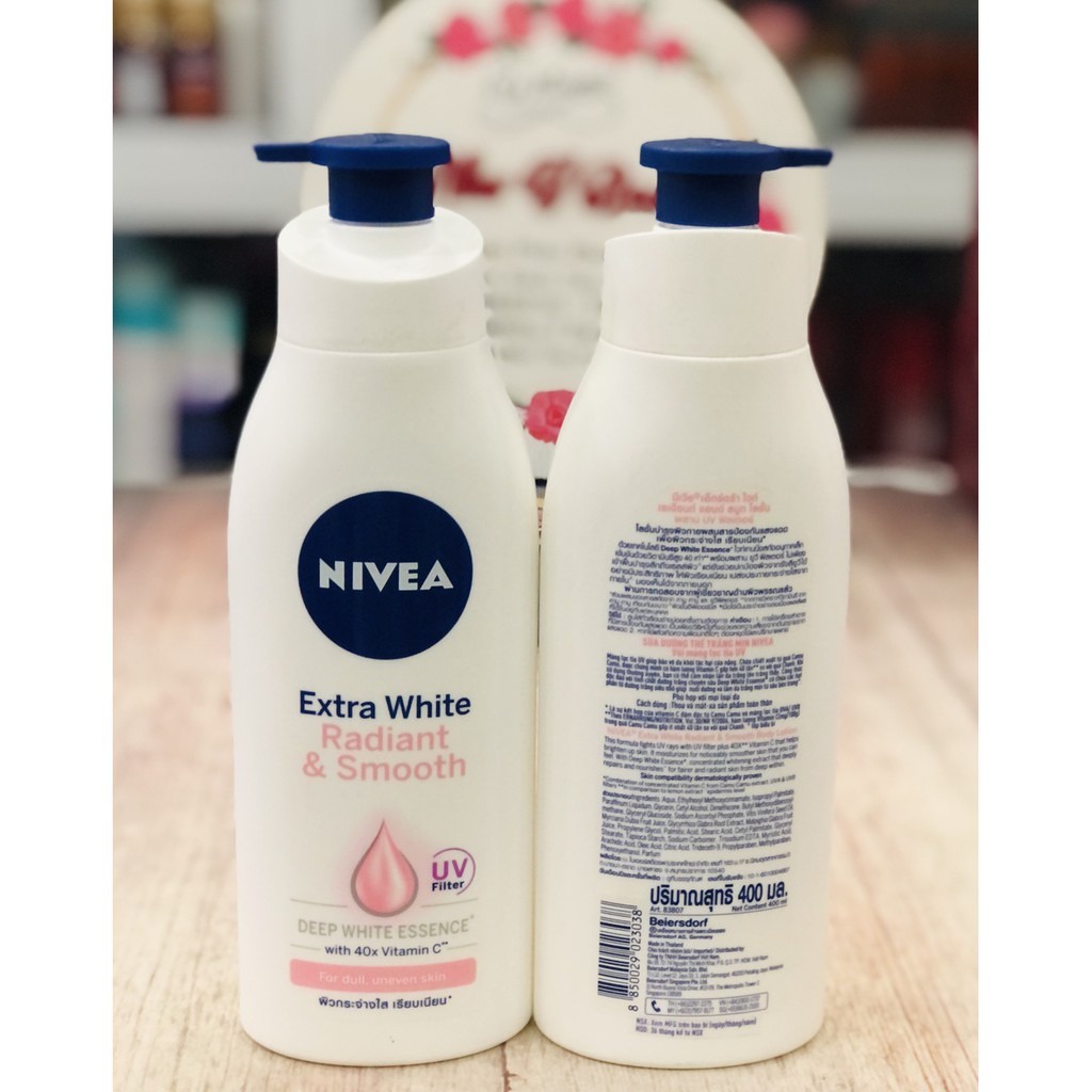 Sữa dưỡng thể Nivea (ban ngày) - Extra White Radiant & Smooth với màng lọc tia UV giúp bảo vệ da khỏi ánh nắng mặt trời.Bổ sung chiết xuất từ quả Camu Camu, có hàm lượng Vitamin C gấp 40 lần so với quả chanh, dưỡng da giúp hỗ trợ tối đa quá trình nuôi dưỡng và hỗ trợ phục hồi các vấn đề của da do ánh nắng và sức nóng mặt trời ban ngày gây ra, cho làn da bạn dần trở nên trắng mịn rạng rỡ. Đồng thời, 10 vitamin và dưỡng chất trong sản phẩm sẽ giúp cân bằng độ ẩm, nuôi dưỡng cho làn da khỏe mạnh, mịn màng và cải thiện màu da đáng kể.