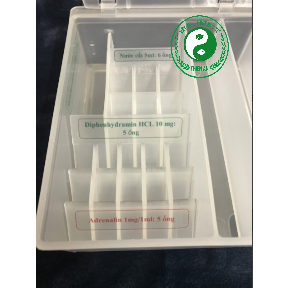 - Ngăn lớn phía trái thân hộp rộng 9cm x dài 17 cm được chia làm nhiều ngăn nhỏ chứa: hàng đầu tiên Adrenalin 1mg/1ml: 5 ống – hàng thứ 2 chứa Diphenhydramin HCL 10mg: 5 ống – hàng thứ 3 chứa: nước cất 5ml: 6 ống và Methylprednisolone 40mg: 2 lọ
