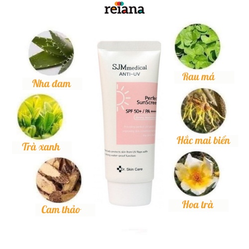 - Là một trong những dòng kem chống nắng bảo vệ da mới, có khả năng bảo vệ da cực kỳ cao với chỉ số SPF50+/PA++++ giúp bảo vệ làn da trước tia UVA/UVB, giúp chống lại các dấu hiệu lão hóa do ánh nắng mặt trời gây ra. Đặc biệt, SJM Medical Anti UV Perfect SunScreen có công thức độc đáo nên em ý có công năng điều chỉnh sắc da tùy theo từng vấn đề riêng biệt và che phủ tự nhiên, nâng tông da hiệu quả.