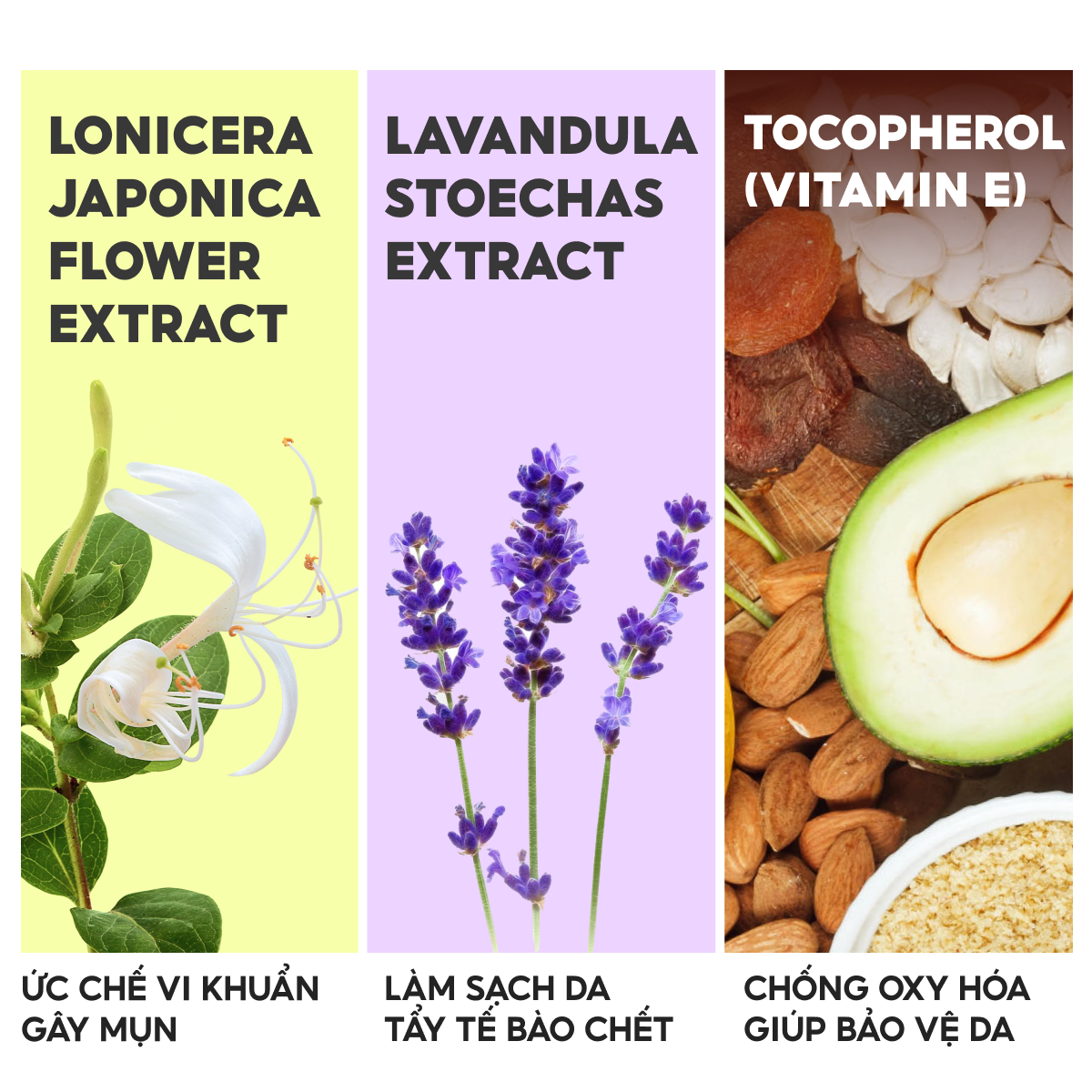 Vitamin E, Chiết xuất Hoa Kim Ngân và Oải Hương: Hỗ trợ ngăn ngừa lão hóa da, giảm thiểu nếp nhăn, đồi mồi và làm đều màu da nhờ khả năng chống oxy hóa hiệu quả.