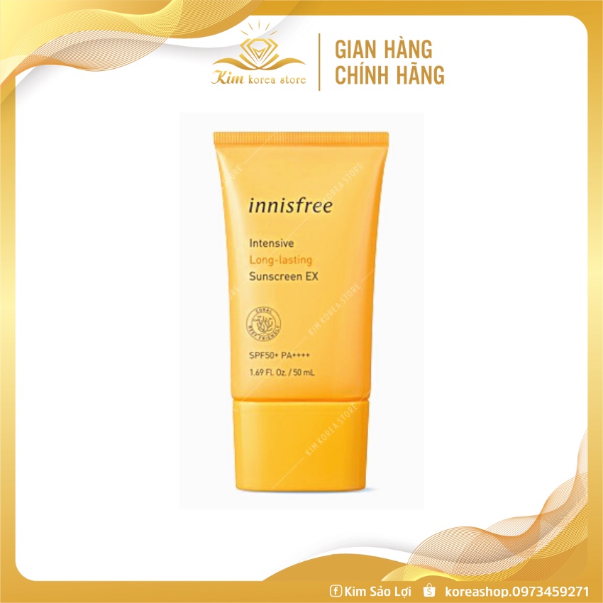 - Intensive Long Lasting Sunscreen Spf 50 Pa++++ 50ml là kem chống nắng lai hóa học và vật lý mới ra mắt phiên bản mới vào đầu năm 2019 của Innisfree. Với chiết xuất từ tinh dầu hoa hướng dương và lá trà xanh từ đảo Jeju bảo vệ da khỏe mạnh khỏi tia UV và môi trường có hại khác trong nhiều giờ mà không bị trôi bởi mồ hôi hay bã nhờn trên da.