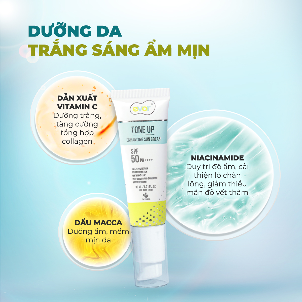 Kem chống nắng nâng tone makeup trẻ hoá dưỡng trắng - Tone Up Enhancing Sun Cream 30ml | EVOR