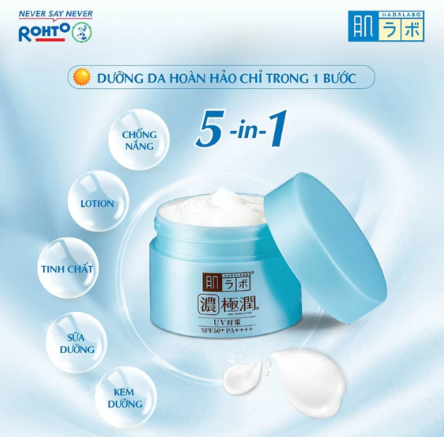 Kem dưỡng ẩm chống nắng Hada Labo với công dụng bảo vệ da tối ưu trước ánh nắng mặt trời, đồng thời dưỡng ẩm và ngăn ngừa hình thành nếp nhăn và sạm da