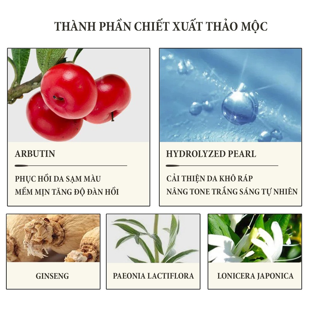 ♥️♥️ Thành phần: nhân sâm, bột ngọc trai, phấn hoa sen tuyết, Arburtin, Vitamin C E, Collagen và rất nhiền thành phần tự nhiên khác, …