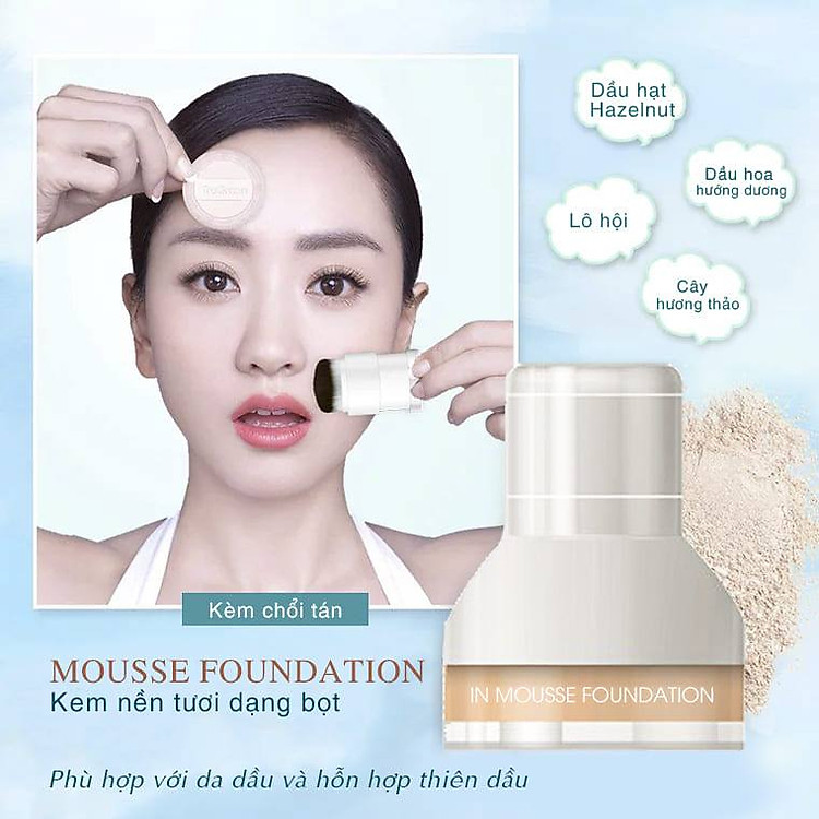 Mousse Foundation chứa Talc là một thành phần hút dầu thừa để tránh làm vỡ và xuống tone lớp makeup, đồng thời bổ sung 3 chất dưỡng ẩm từ thiên nhiên với dầu hoa hướng dương, chiết xuất cánh hoa hồng và lô hội, giúp cân bằng da.