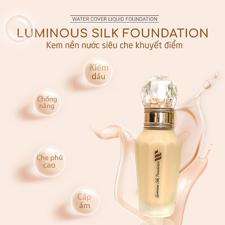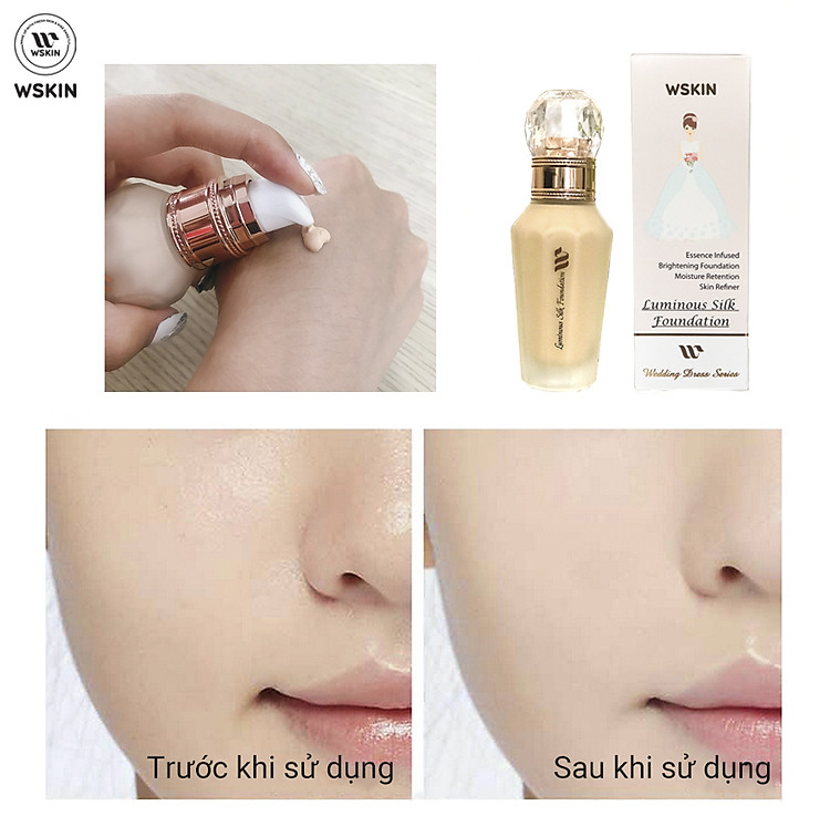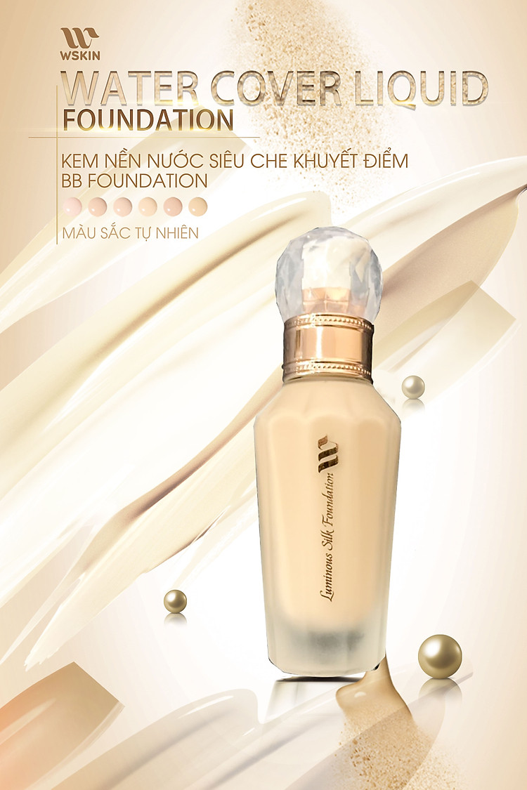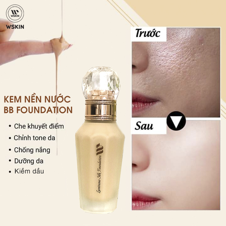 Kem nền được coi là sản phẩm có độ che phủ cao nhất. WSKIN Luminous Silk Foundation có kết cấu dạng nước, là sự kết hợp độc đáo của Foundation và phân tử phản sáng li ti có độ che phủ tốt và cung cấp độ ẩm cho da, bám chắc trên da, duy trì lớp nền trắng mịn suốt cả ngày dài.