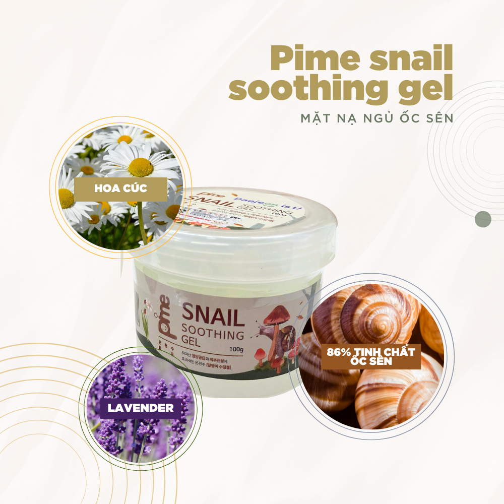 Mặt nạ ngủ Pime Snail Soothing Gel với 86% chiết xuất dịch ố_c s_ê_n giàu allatonin giúp nuôi dưỡng da và cấp ẩm từ sâu bên trong, thúc đẩy mô tái sinh, sửa chữa cấp độ tế bào, nhẹ nhàng lấy đi lớp tế bào già cỗi, lớp mụn ẩn dưới da, kích thích sản sinh tế bào mới. Hỗ trợ làm dịu da nhanh chóng, giúp đem lại làn da mịn màng, ẩm mịn, hạn chế lão hóa, ngăn ngừa vi khuẩn gây mụn. Nhờ kết cấu gel thấm nhanh, mặt nạ giúp làm dịu da tức thì, giảm kích ứng rõ rệt khi da mới gặp nắng, da bỏng rát.