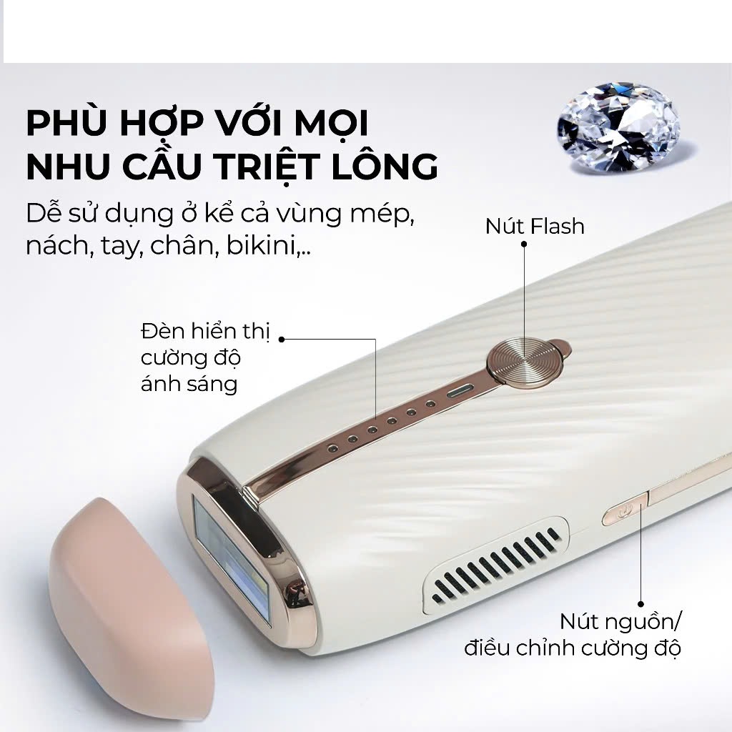 - 4 Chế độ triệt & 5 Cường độ ánh sáng: Có thể điều chỉnh phù hợp với mọi loại da