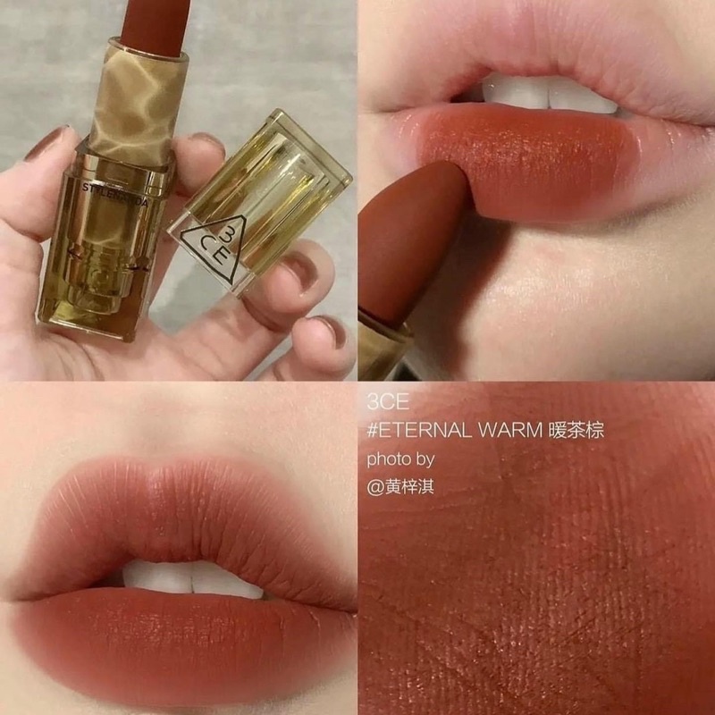 * Son 3CE Soft Matte Lipstick phiên bản đặc biệt của 3CE. Son 3CE Eternal Warm mang gam màu gạch caramel bao bọc, cảm nhận sự ấm áp từ màu sắc. Với chỉ với một lần quẹt cũng đủ làm Bạn thêm lôi cuốn và cuốn hút. Đây là phiên bản limited tuyệt sắc nhất của 3ce trong năm này đó ạ.