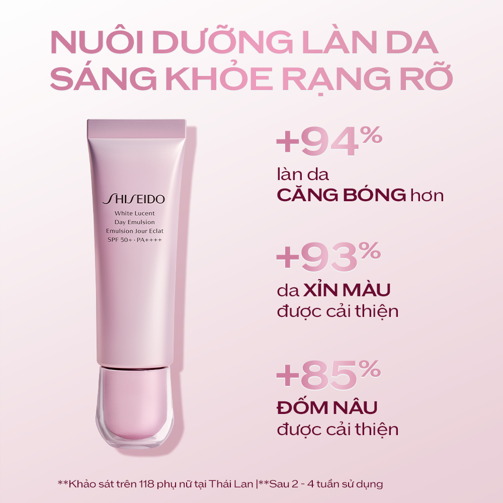 Kem dưỡng trắng da ban ngày Shiseido White Lucent Brightening Day Emulsion với kết cấu dạng sữa lỏng sẽ nhẹ nhàng tạo lớp màng mỏng bao bọc toàn bộ da mặt, giúp mang lại cảm giác tươi mát, cho da luôn thông thoáng suốt ngày dài. Ngoài khả năng chống nắng, kem dưỡng còn giúp giảm thiểu những mệt mỏi, căng thẳng trên da, cải thiện lại cấu trúc da săn chắc, đồng thời tăng cường dưỡng ẩm giúp mang lại làn da trắng sáng tinh khiết, rạng rỡ từ sâu bên trong.
