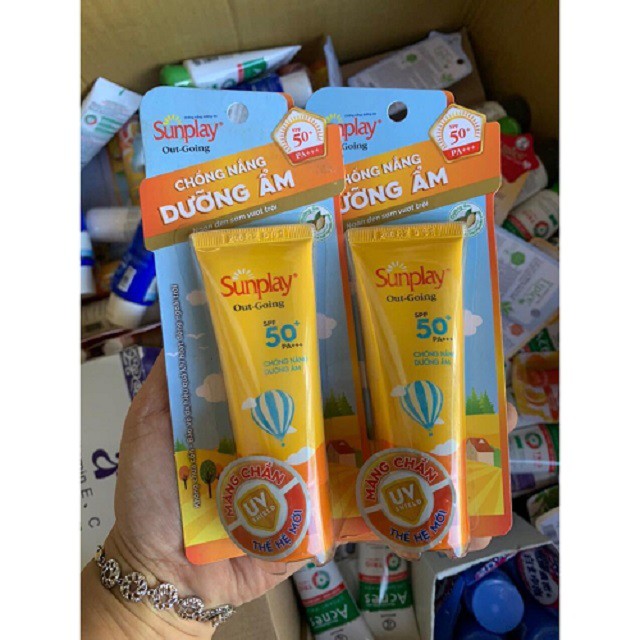 Sunplay Out-Going - Dạng kem mịn, mỏng nhẹ, không nhờn rít, tiện lợi khi sử dụng. Chỉ số SPF50+, PA+++, chiết xuất Aloe Vera tạo Màng Thông Minh “Thế hệ mới” giúp ngăn ngừa tác động của tia UVA & UVB, bảo vệ và nuôi dưỡng làn da khi phải vận động ngoài trời. Dưỡng ẩm với bơ ca cao