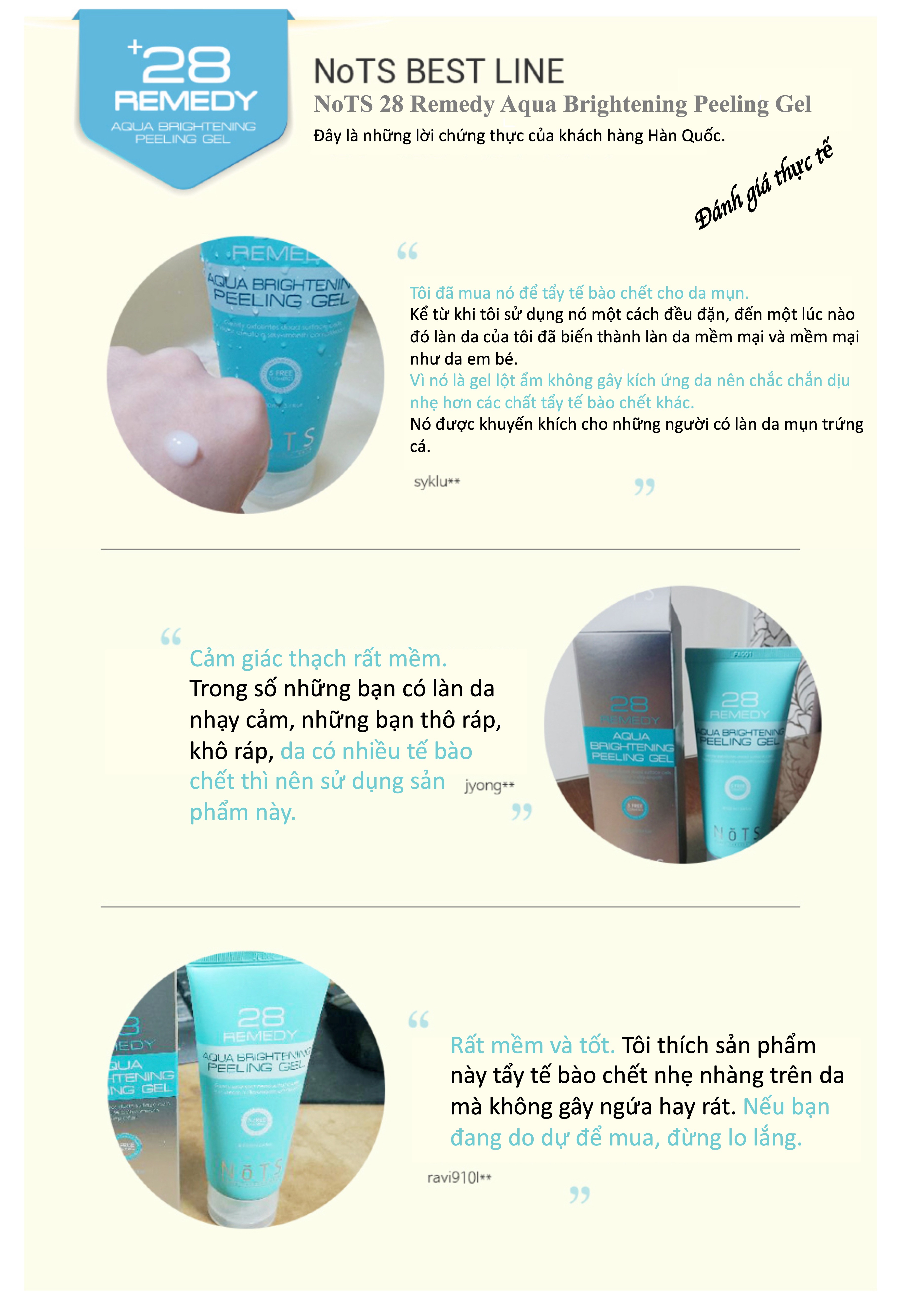 - Gel Tẩy Tế Bào Chết Trắng Da NoTS 28 Remedy Aqua Brightening Peeling Gel 100ml giúp da loại bỏ các bã nhờn chuyên sâu