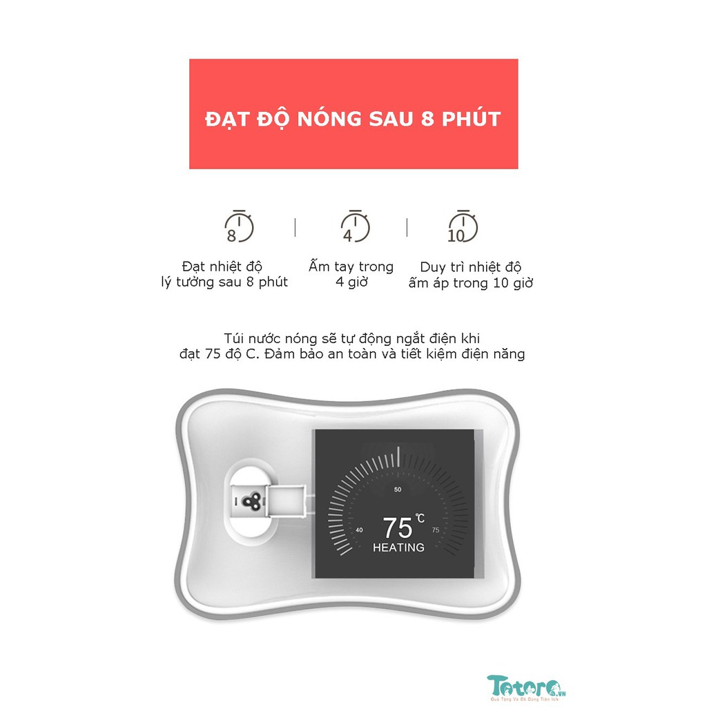 - Túi sưởi duy trì nhiệt độ thích hợp để sưởi tay trong vòng 3 - 4 tiếng. Và tiếp tục duy trì nhiệt ấm tới 8 tiếng đồng hồ.