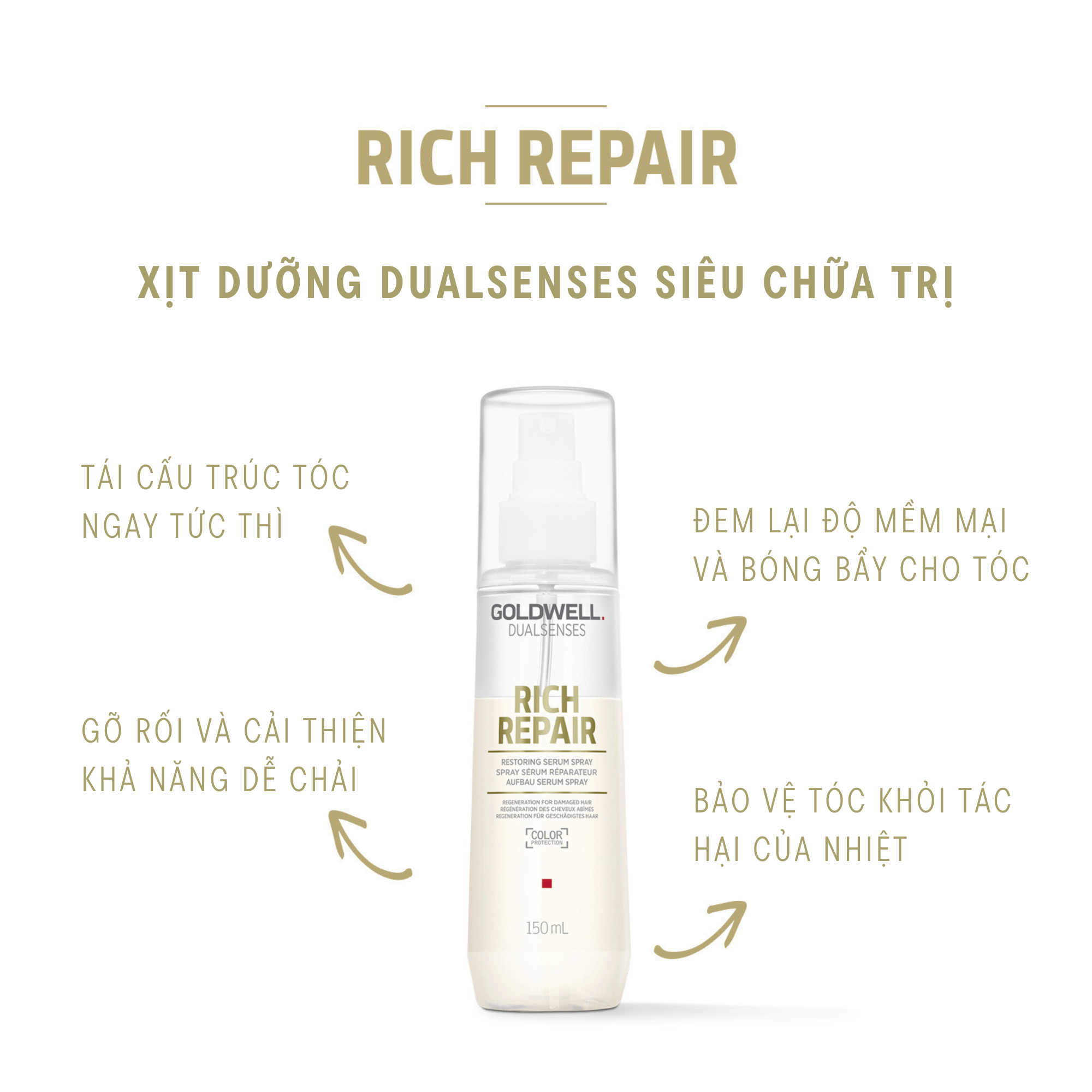 - Sử dụng kết hợp với các sản phẩm cùng dòng Goldwell Rich Repair để đạt kết quả tối ưu trong việc phục hồi hư tổn, giảm gãy rụng và nuôi dưỡng tóc chắc khỏe.