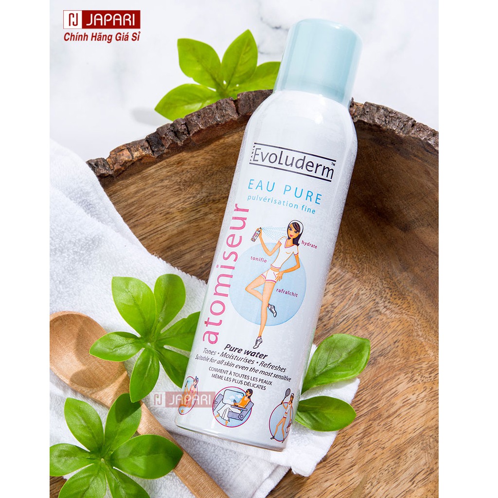 Evoluderm là thương hiệu chăm sóc sắc đẹp và cơ thể nổi tiếng với các dòng sản phẩm đa dạng, chất lượng cao và giá cả cạnh tranh. Được sản xuất, đóng gói tại Pháp trong phòng thí nghiệm đạt tiêu chuẩn GMP và ISO 9002, Xịt khoáng dưỡng da Evoluderm Atomiseur Eau Pure của Pháp là một trong những loại xịt khoáng cho da mặt và toàn thân tốt. Với thành phần nước khoáng tinh khiết, giàu nguyên tố vi lượng và chất khoáng có đặc tính làm dịu. Với thành phần chính là nước tinh khiết nên xịt khoáng Evoluderm đảm bảo lành tính và không gây kích ứng với các loại da, thậm chí cả những người sở hữu làn da mỏng manh, nhạy cảm. Trong khi đó, Nitrogen lại có tác dụng nhanh chóng làm dịu những tổn thương của da do nắng gây ra.