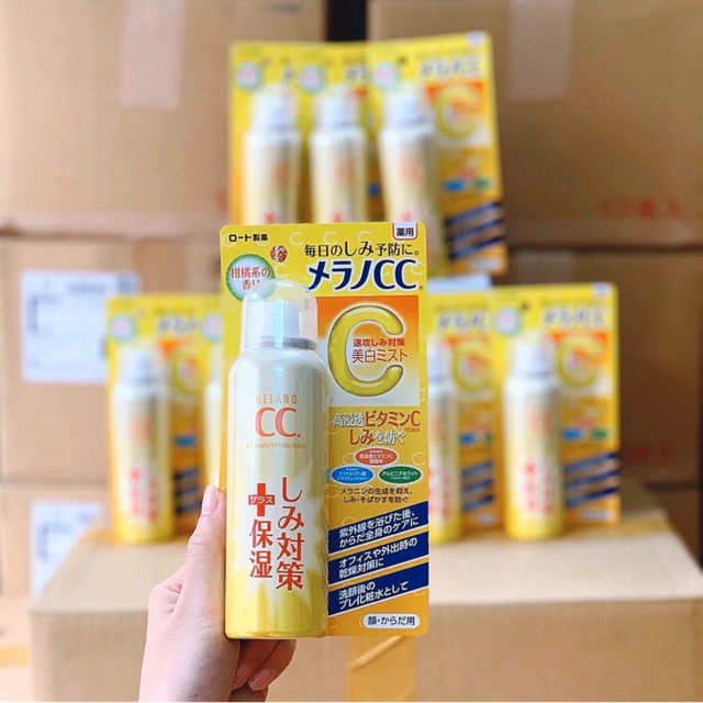 - Xịt Khoáng Trắng Da Rohto Melano CC Whitening Mist 100g thuộc dòng dưỡng trắng da vitamin C của Rohto sẽ mang lại cho bạn giải pháp toàn diện nhất trong việc chăm sóc da. Bằng cách ức chế quá trình sản xuất melanin hiệu quả, dẫn xuất vitamin C thấm sâu, dưỡng trắng da tự nhiên, chống oxi hóa, ngăn ngừa hình thành hắc sắc tố Melanin, làm mờ phòng chống các vết thâm nám, tàn nhang.